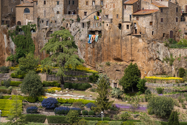 Een fraaie impressie van dat eeuwenoude stadje in Toscane. Bijzonder inderdaad om te zien hoe de rotsen naadloos overgaan in huizen. Een hele toer lijkt me inderdaad om bij sommige huisje ste komen met al die trappen. Je geeft aan dat je daarvoor goed ter been moet zijn, maar dat zou je op de foto waar die man op z'n stoeltje zit te lezen met die slippertjes aan niet zeggen. Het moet een prachtige reis geweest zijn en je hebt er een serie met een hoog educatief karakter van gemaakt.